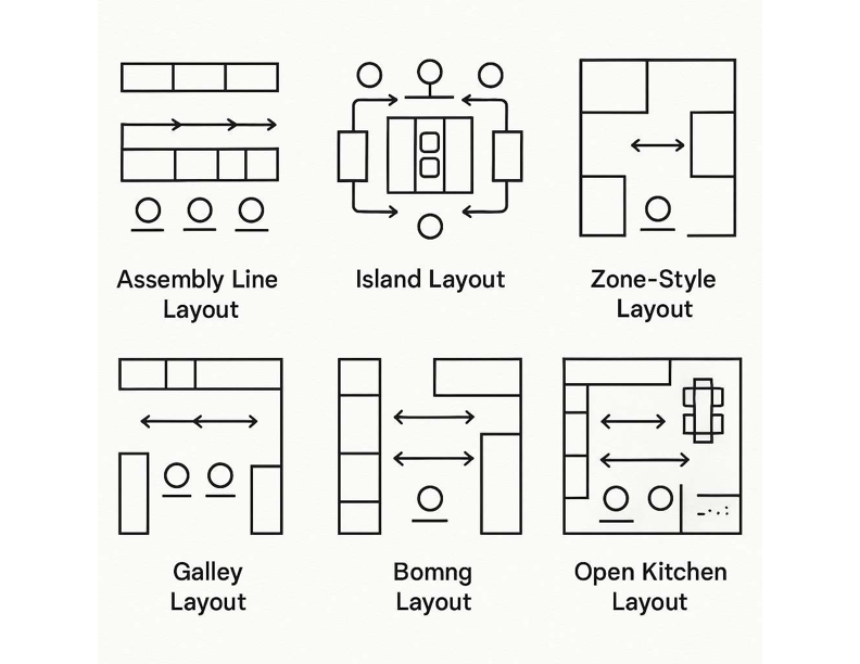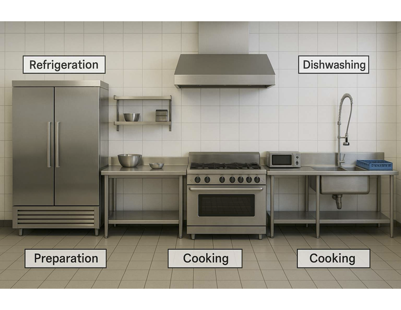 In a commercial kitchen, the workflow is typically organized around three main work centers to en...